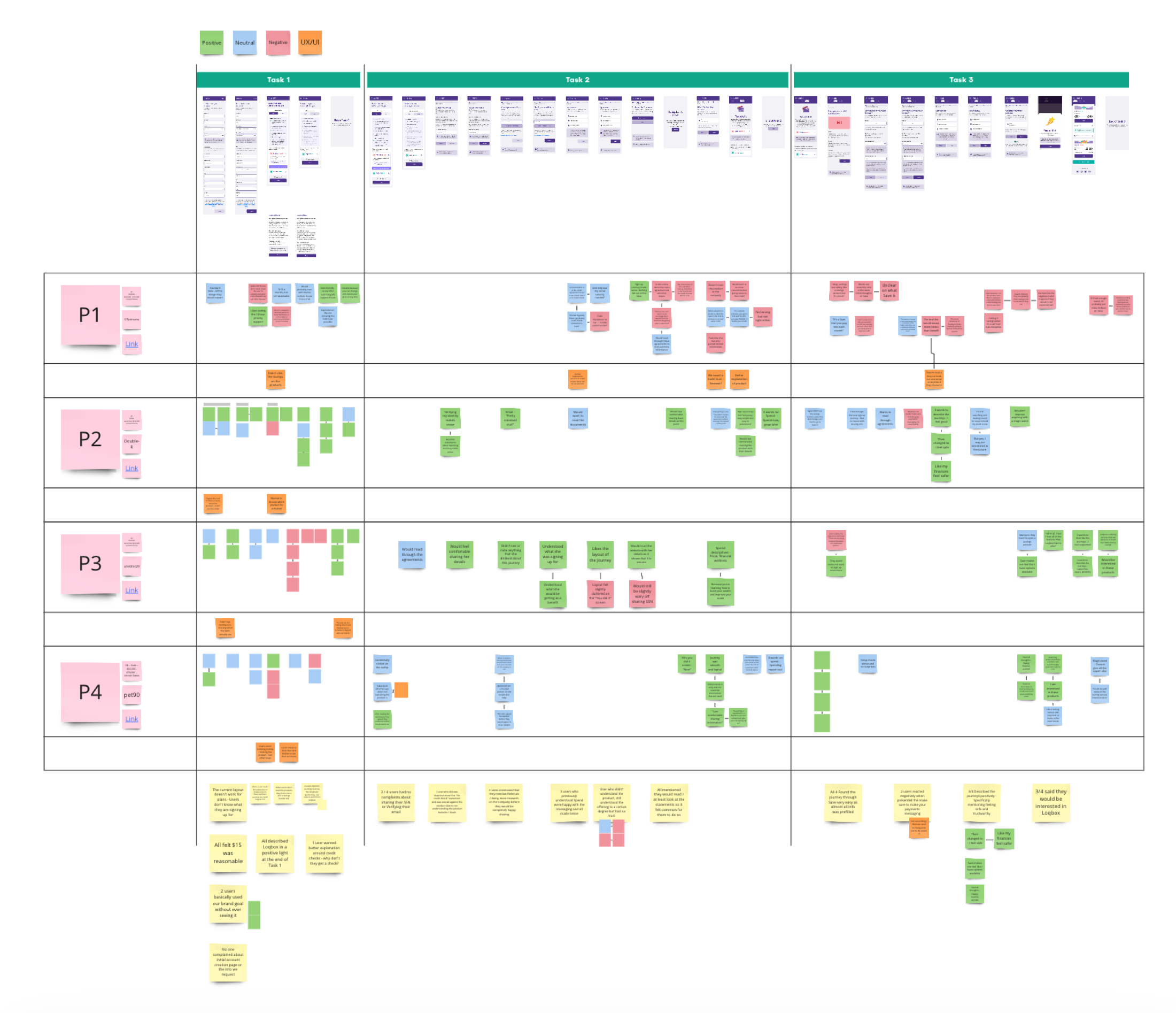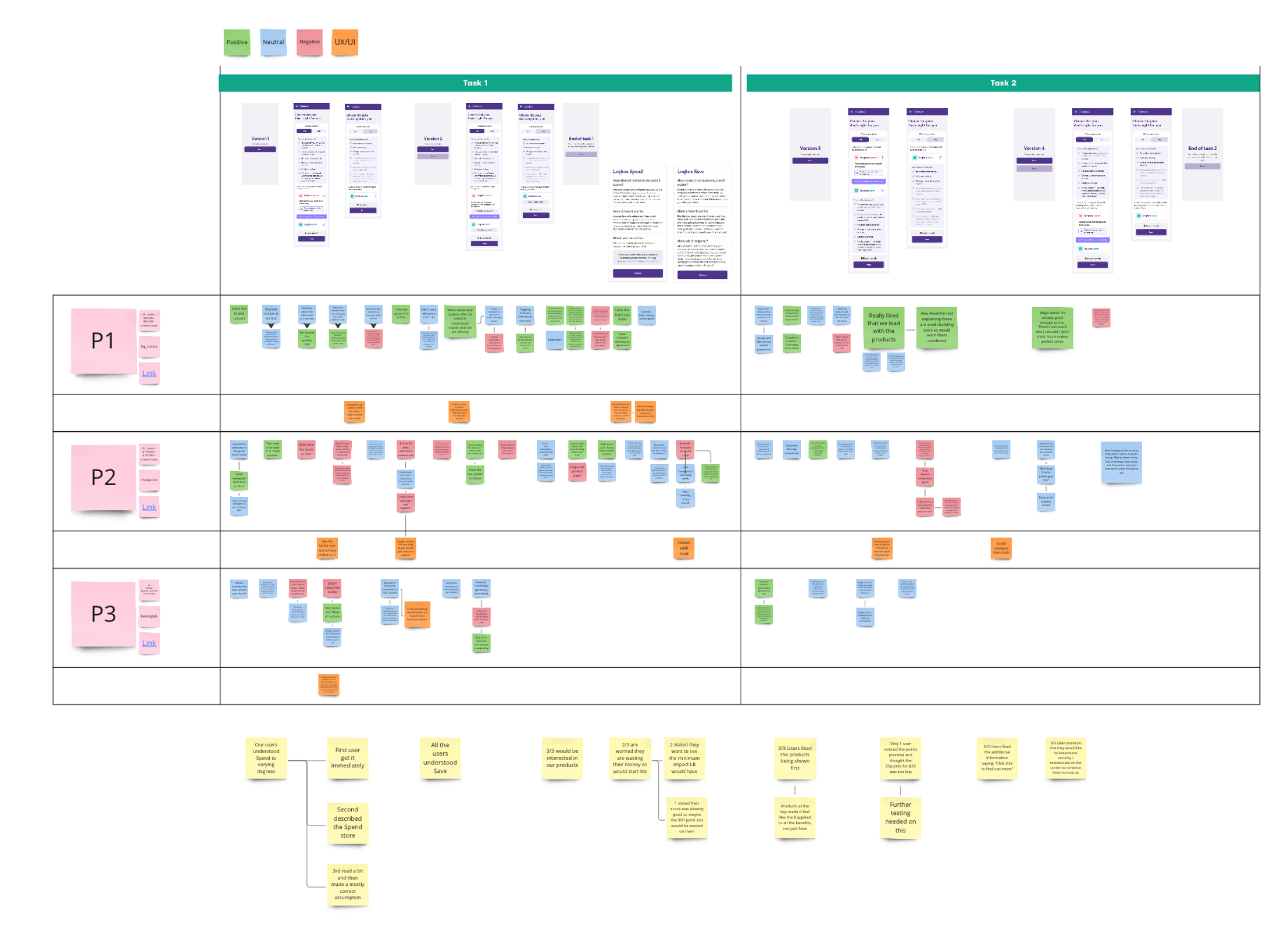 Once we had the 4 users run through the above tests the improvements required became quite clear as all our users mentioned similar issues. After recording the notes based on the interviews I wanted to synthesise the results into clear improvements that we should make. To do this I broke them down into, positive (Green), neutral (Blue) , and negative (Red) comments relating to the relevant screens, I also included a 4th type which related to UX/UI comments that we should consider (sisplayed in Orange). This helps to visualise where our users are facing issues with our journey and highlight areas where we are effective.