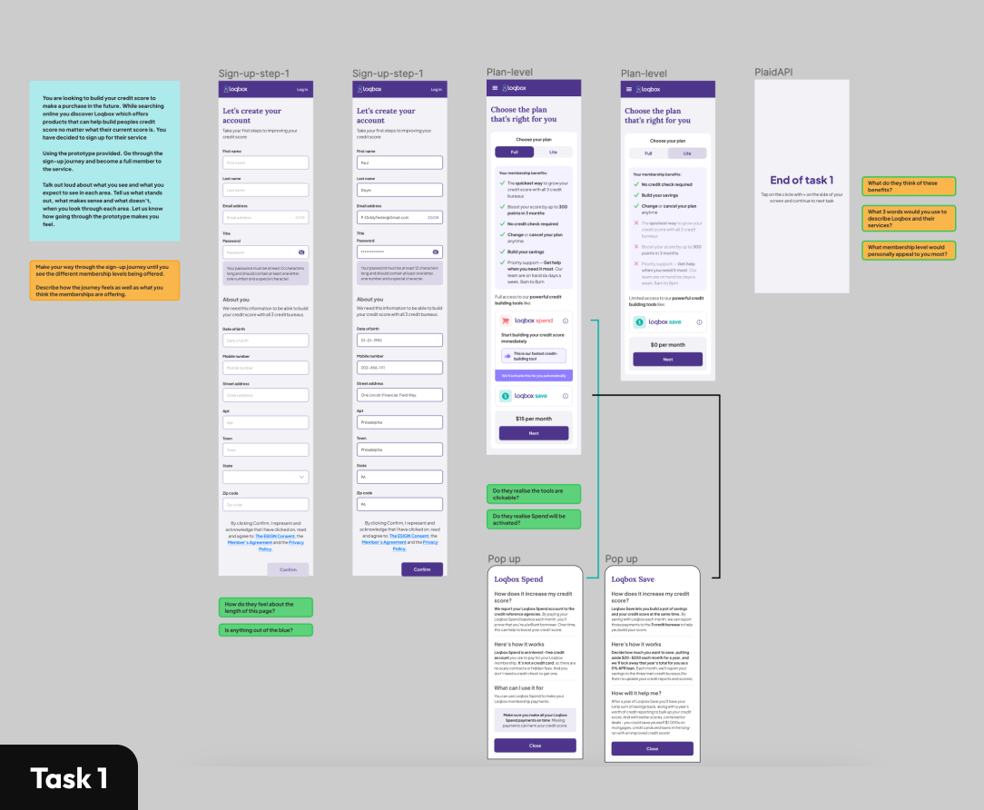 This experiment was broken down into 2 tasks. Both times the goal was to complete the sign-up journey talking through how well you understand the product and how you would feel while completing the journey. With the focus being on the delivery of the extra information, I chose to do two designs. One in which the user is presented with a clear CTA for them to use and the second option is a tooltip icon.