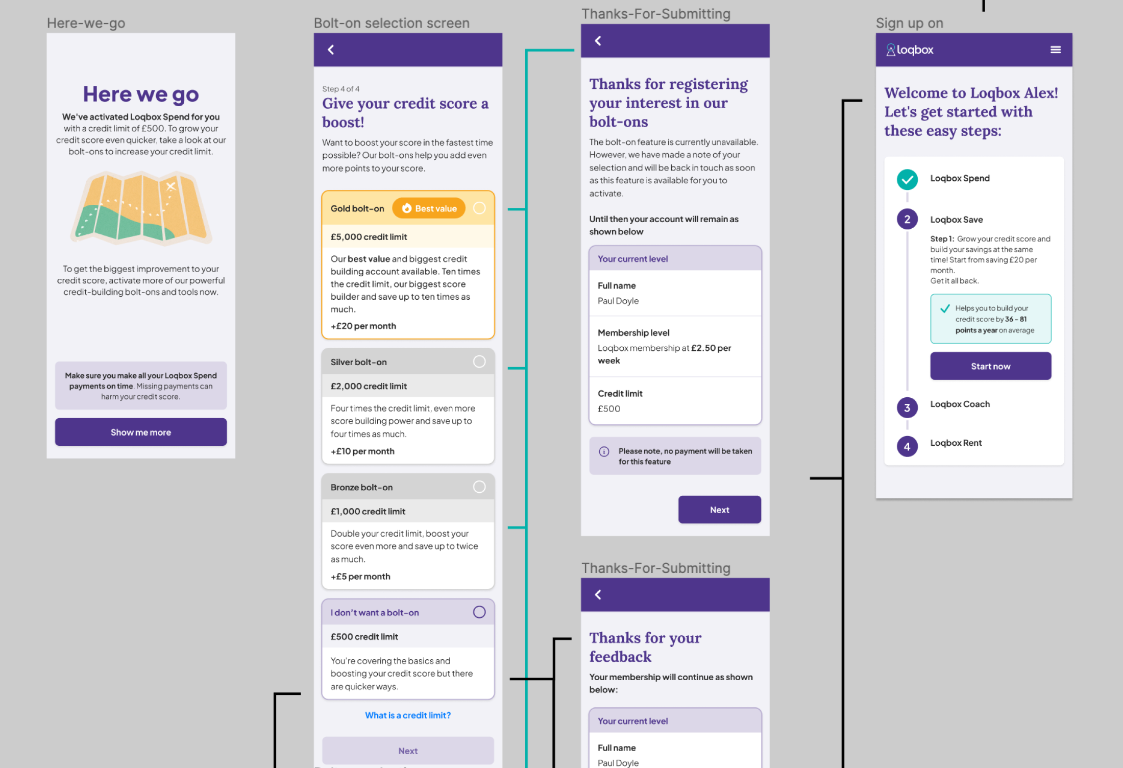 For the initial test, everything felt straightforward. But once we looked at the mechanism of purchasing a bolt-on on a line of credit, things started to get complicated. To try to combat this I began mapping out the different journeys our users could take. Starting from the happy path and moving on from there.